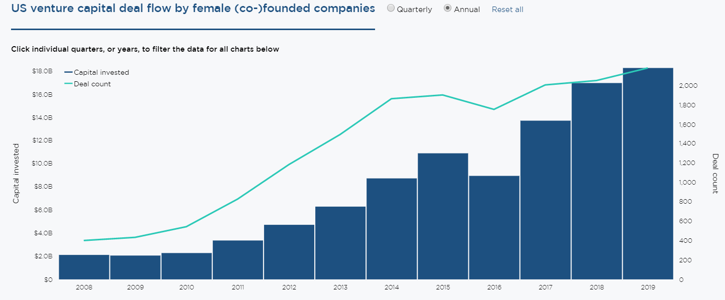Female investors are finally starting to get their fair seat at the table. Despite the most popular names in venture capital being David, Michael, and John, there is a positive trend nationally and in the Boston tech scene changing this. VC investment in all-female founding teams hit $3.3B in 2019, representing 2.8% of US venture capital. Read more in Carta’s gender equity gap study, Tide’s female founder data, and consider partnering with AllRaise.