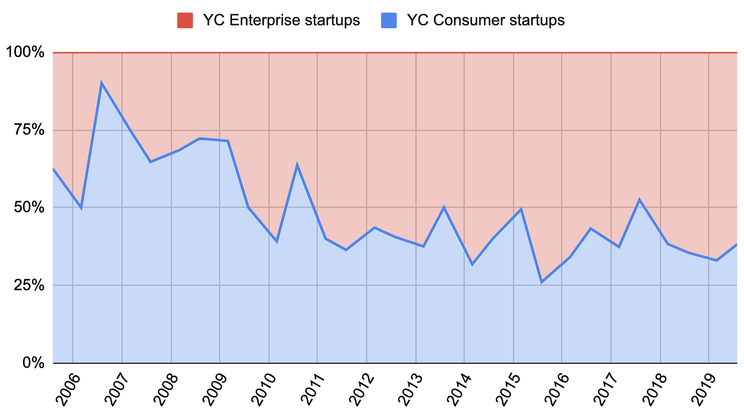 According to new research done by Pitchbook, B2B has overtaken B2C in total investment. For the first time at the seed level, enterprise startup investment has overtaken consumer-focused investment. Interestingly, Eric Feng also used YC investment history as a proxy and found similar results. In the 2020s, will we see the enterprise space become bloated and eventually see the pendulum swing back in favor of consumer tech? (Source).