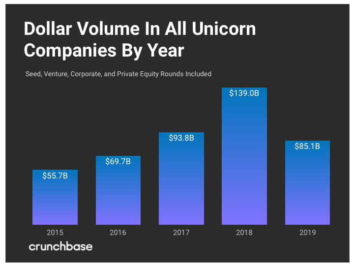 Across the globe in 2019, 142 startups raised $85.1B to achieve the coveted “unicorn status” of a $1B or more valuation. Of those 142, 78 were US-based companies. Surprisingly, unicorn companies in 2019 raised the least amount of capital since 2016. Who invests in the most unicorns? Insight Partners, Spark Capital, Tiger Global, NEA, and GV. (Source)